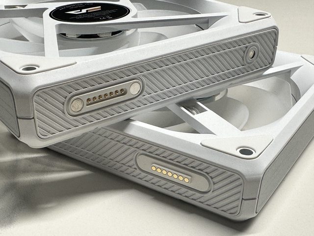 前後側則為連結位置,採用磁吸方式串接風扇,看得到磁鐵及彈簧針的那側為風扇串接觸