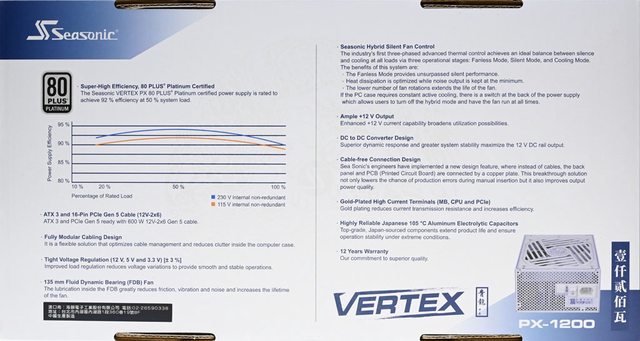 ▼外盒左側面有VERTEX標誌、青龍甲辰落款、Seasonic商標、PX-1200名稱、產品規格表