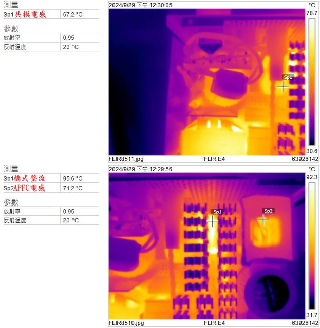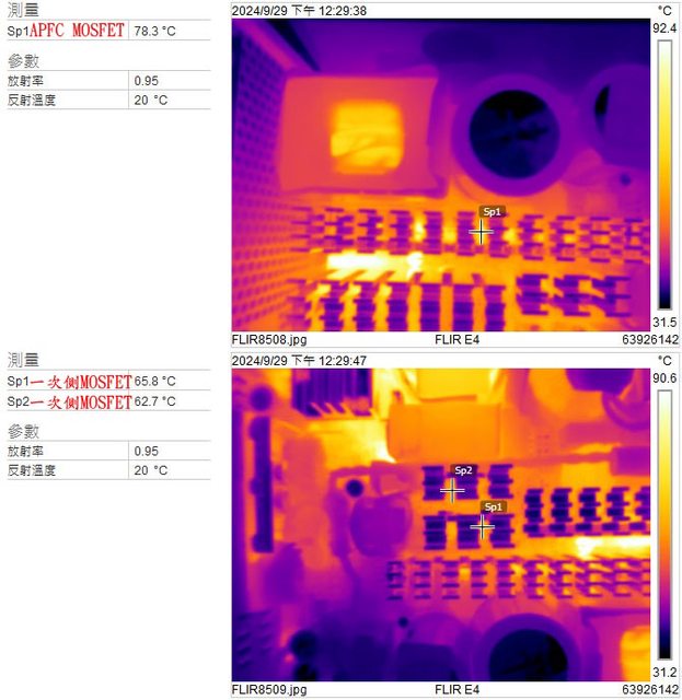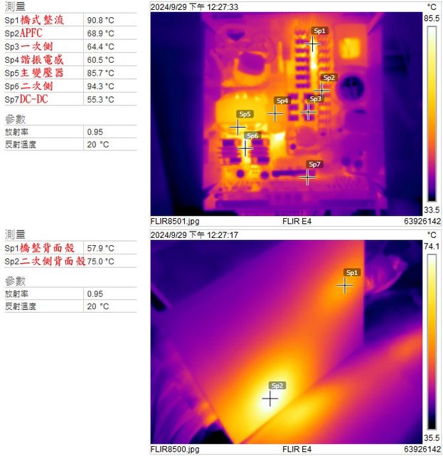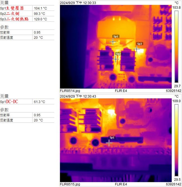 ▼電源供應器滿載輸出下主變壓器/二次側(上圖)及DC-DC(下圖)的紅外線熱影像圖(附註