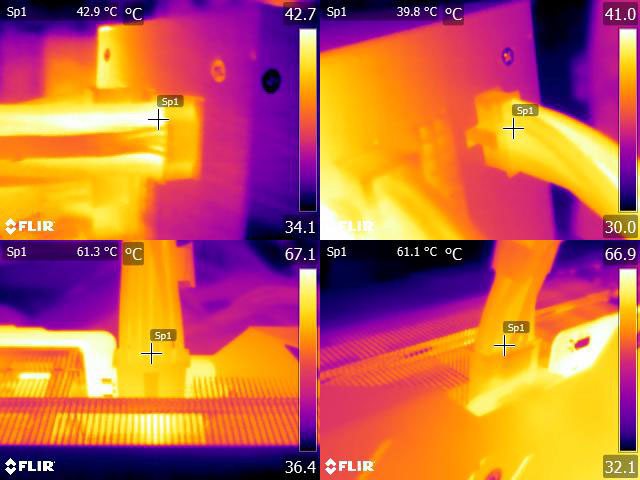 ▼執行FURMARK 30分鐘後電源端插頭(左上/右上)及顯示卡端插頭(左下/右下)的紅外線熱