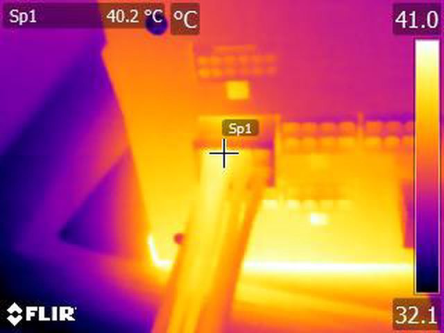 ▼單條EPS 4+4P連續輸出28A(336W)10分鐘後的電源端模組化接頭紅外線熱影像圖(附註: