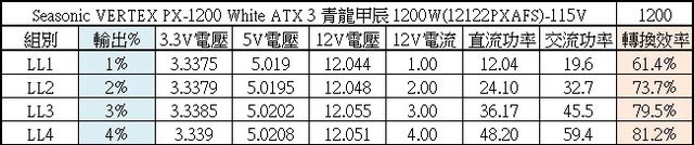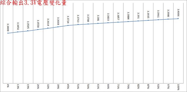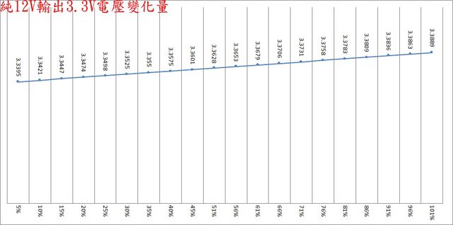○偏載測試,12V維持空載,測試3.3V滿載、5V滿載、3.3V/5V滿載的3.3V/5V/12V電壓變