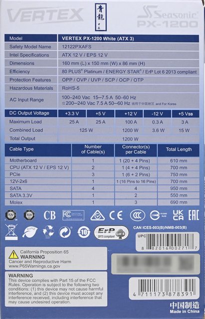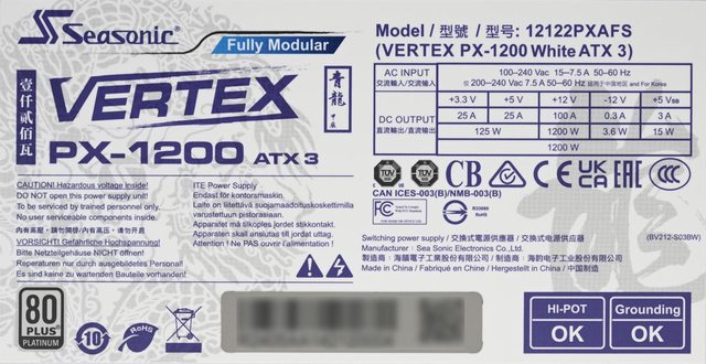 ▼本體背面標籤有Seasonic商標、壹仟貳佰瓦國字、VERTEX標誌、PX-1200 ATX 3名稱、