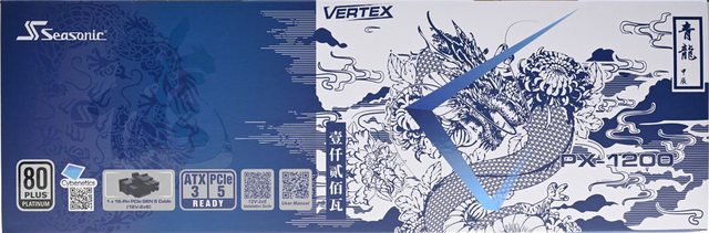 ▼外盒右側面有Seasonic商標、青龍甲辰落款、龍圖案、VERTEX標誌、PX-1200名稱、
