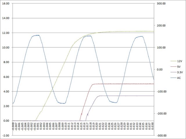 ○電源啟動至綜合全負載輸出狀態,12V上升時間27ms,5V上升時間5ms,3.3V上升時間