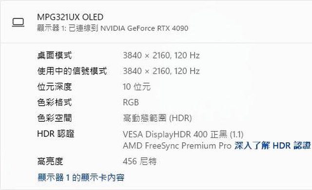▼進階顯示設定的顯示器內容資訊,可使用3840×2160@120Hz信號模式,並支援10位元色