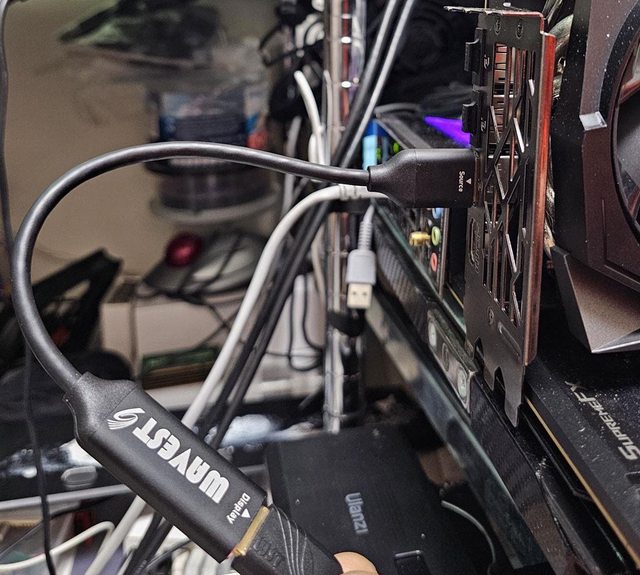 ▼MSI GEFORCE RTX 4090 GAMING X TRIO的DP輸出經過WST-LAD001連接HDMI線並將信號送