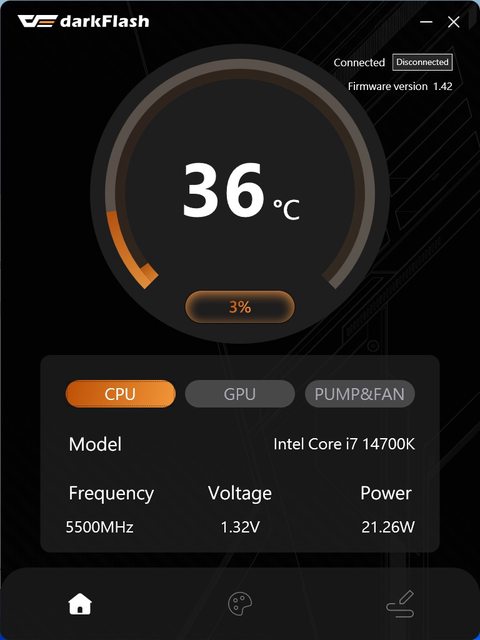 主介面為硬體監控,可切換選擇顯示CPU資訊、顯示卡資訊或是水泵跟風扇的轉速資訊。