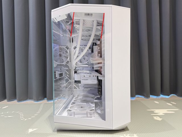 DY470上方因為有玻璃側板,水冷安裝位置稍微向內且因應機殼高度帶有一個斜角,本次