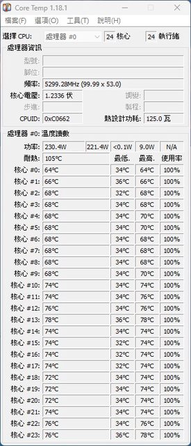 P核最高70度,E核78度功耗在 230W-250W (PL2)