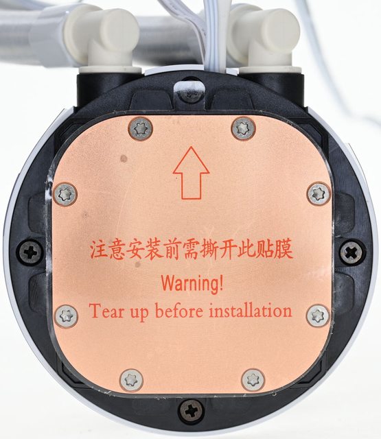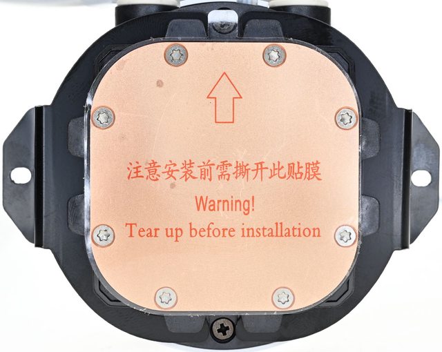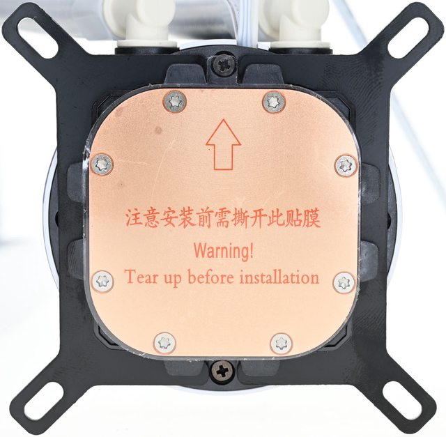 ▼水冷頭處理器接觸面有一張保護貼,上面印上"注意安裝前需撕開此貼膜"中文及"警告