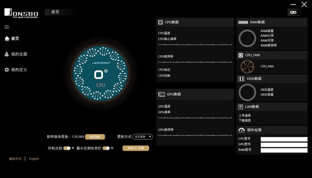 設按鈕、CPU/GPU/RAM/CPU風扇/HDD/LAN監控數據、硬體型號檢測