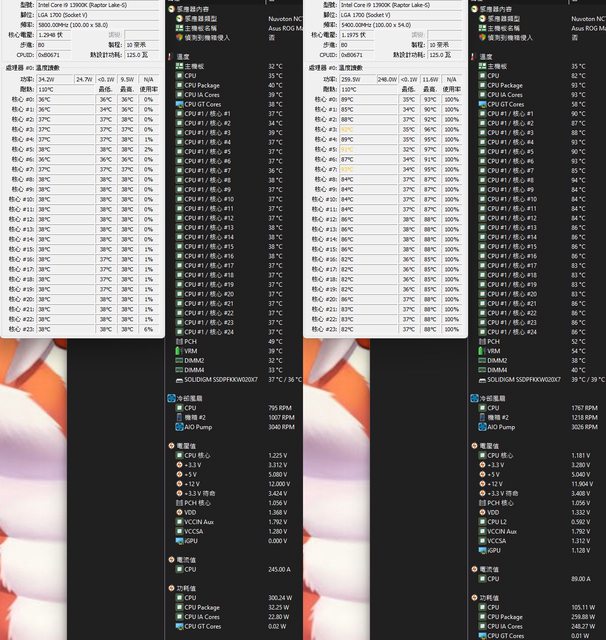 ▼功耗限制260W下待機(左)及高負載(右)的CORE TEMP及AIDA64感測器畫面