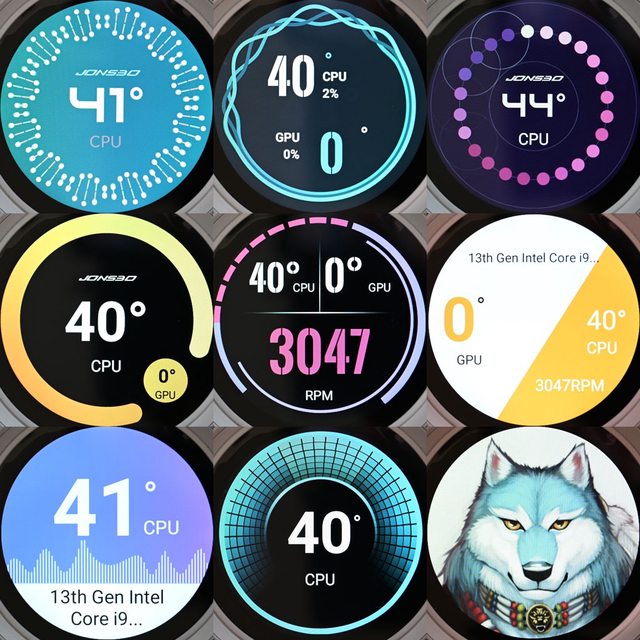 ▼預設主題1至8及自定義背景圖片在水冷頭螢幕上實際顯示效果