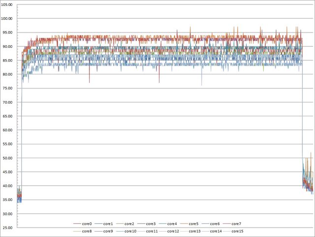 ▼功耗限制260W下高負載30分鐘CORE TEMP溫度記錄圖