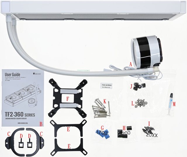 LGA20xx托架固定螺柱(I)、手轉螺帽(J)、風扇固定用長螺絲(K)、冷排固定用短螺絲(L)