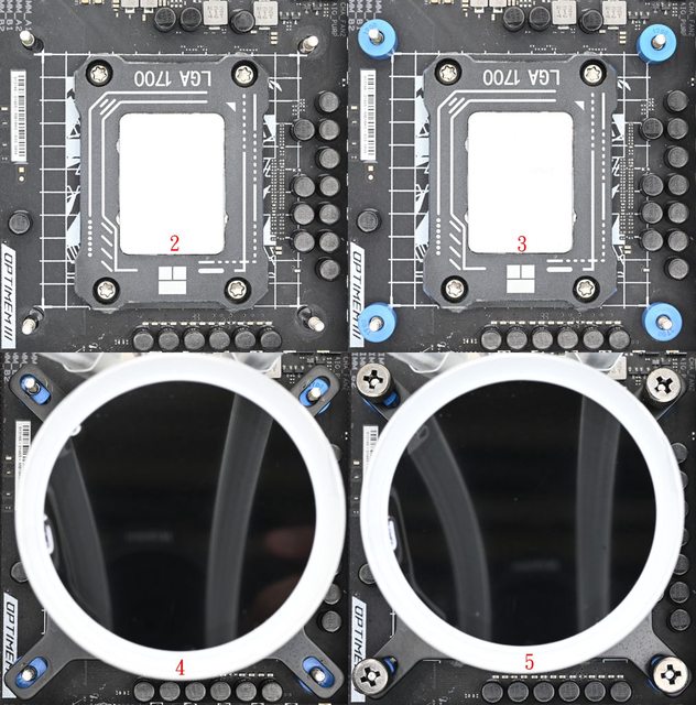 LGA1700藍色套管套入固定螺柱(3)。安裝水冷頭前先確認水管接頭不會與主機板元件/散