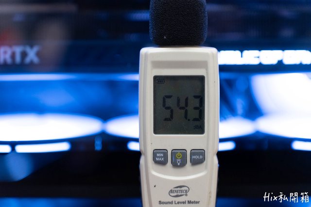 此時全速運轉下,機殼外的分貝數為54分貝,算是很正常的表現