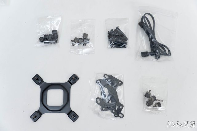 上排:115X及1700墊高套筒、螺帽及扣具螺絲、風扇螺絲及冷排固定螺絲