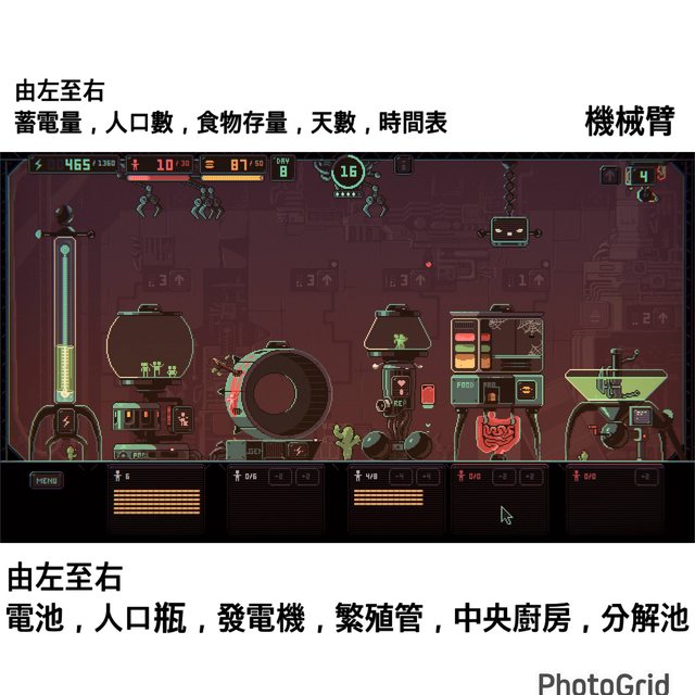 人口瓶:玩家的閒置工人會在這邊。每個人會有體力條,歸零就歸西。
