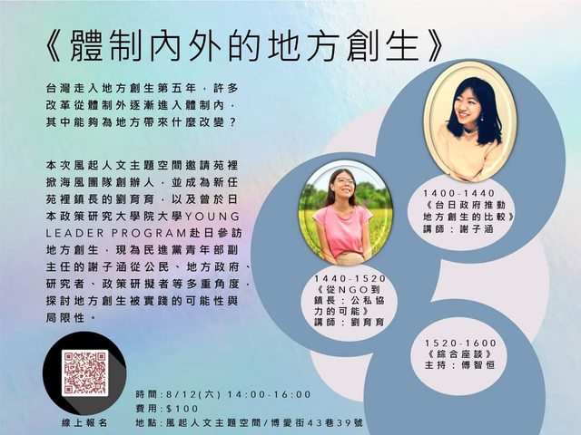 註2:劉育育是苑裡掀海風創辦人,謝子涵是最早進入日本校園學習地方創生且回到台灣