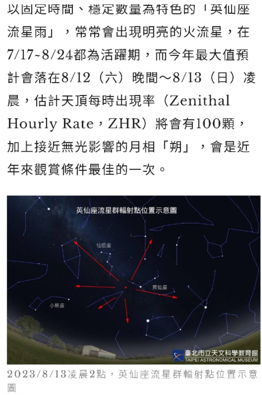 → leewendy : 到中央氣象局、台北天文館官網確認,極大期是寫13 08/13 01:11