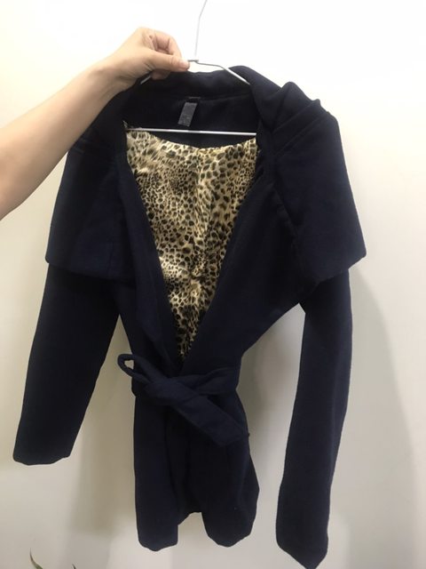2-9韓製 寶藍豹紋花苞外套/少穿/很美/附同款綁帶/有大帽子包圍/