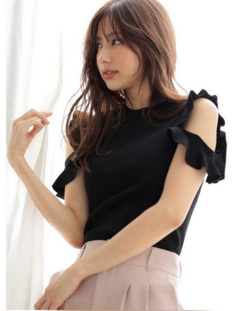 2-4 僅試穿 INGNI 荷葉邊露肩 2way上衣 黑色 M 無留吊牌