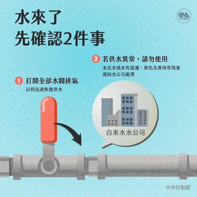 剛恢復供水時,請將全部水閥打開排氣,以利迅速恢復供水。恢復供水後,自來水管線末端
