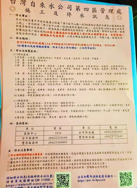 中有大概1/3部分用戶停水及降壓大概1.5天左右,家裡沒有水塔的記得稍微儲水一下,有抽