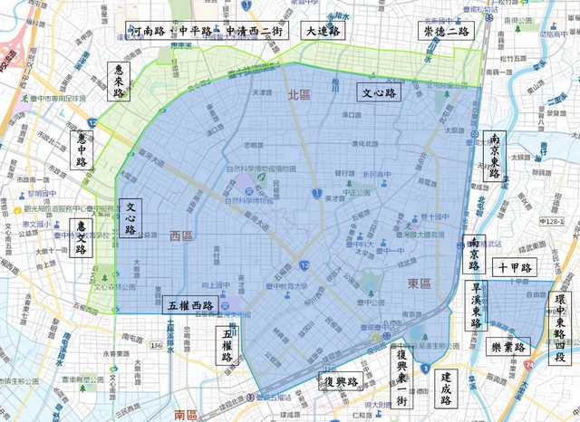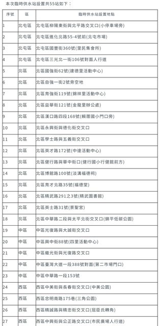 停水區域包含:北屯區、北區、中區、西區、東區、南區、南屯區、西屯區、大雅區及潭子