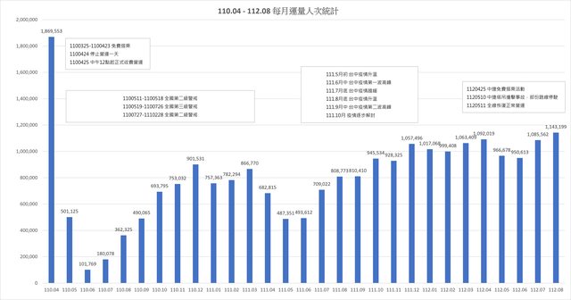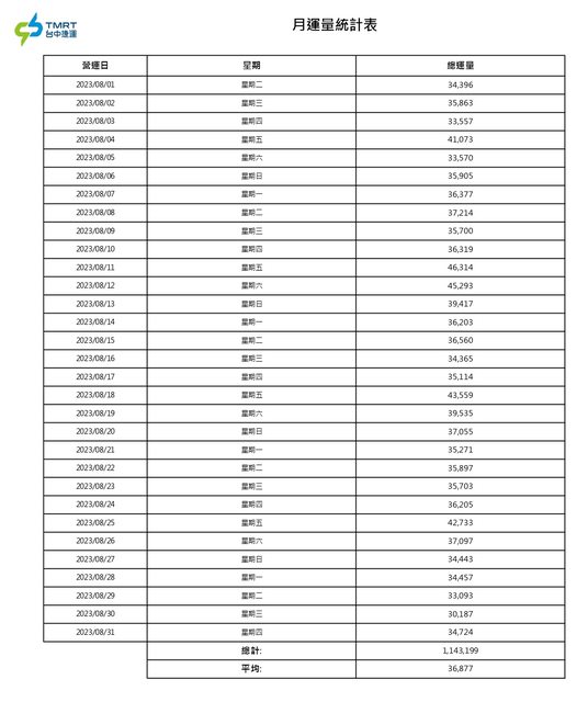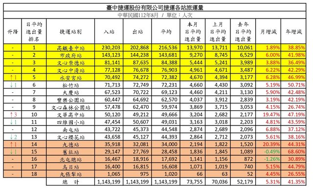 標題Fw: [情報] 台中捷運112年8月各站旅運量