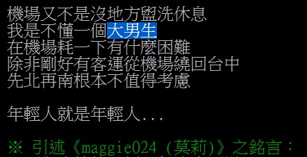 → lightwing : 請問下飛機想盡快回到台中的「maggie024」是男(橘 10/01 12:31