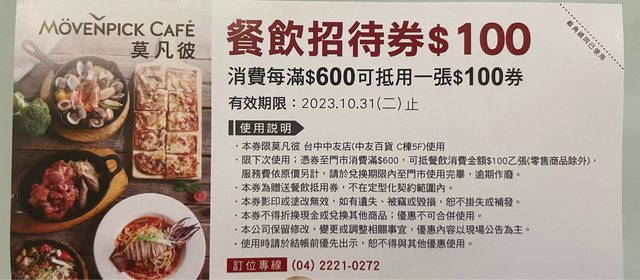 標題[贈送] 南屯 莫凡彼 中友折價券一張