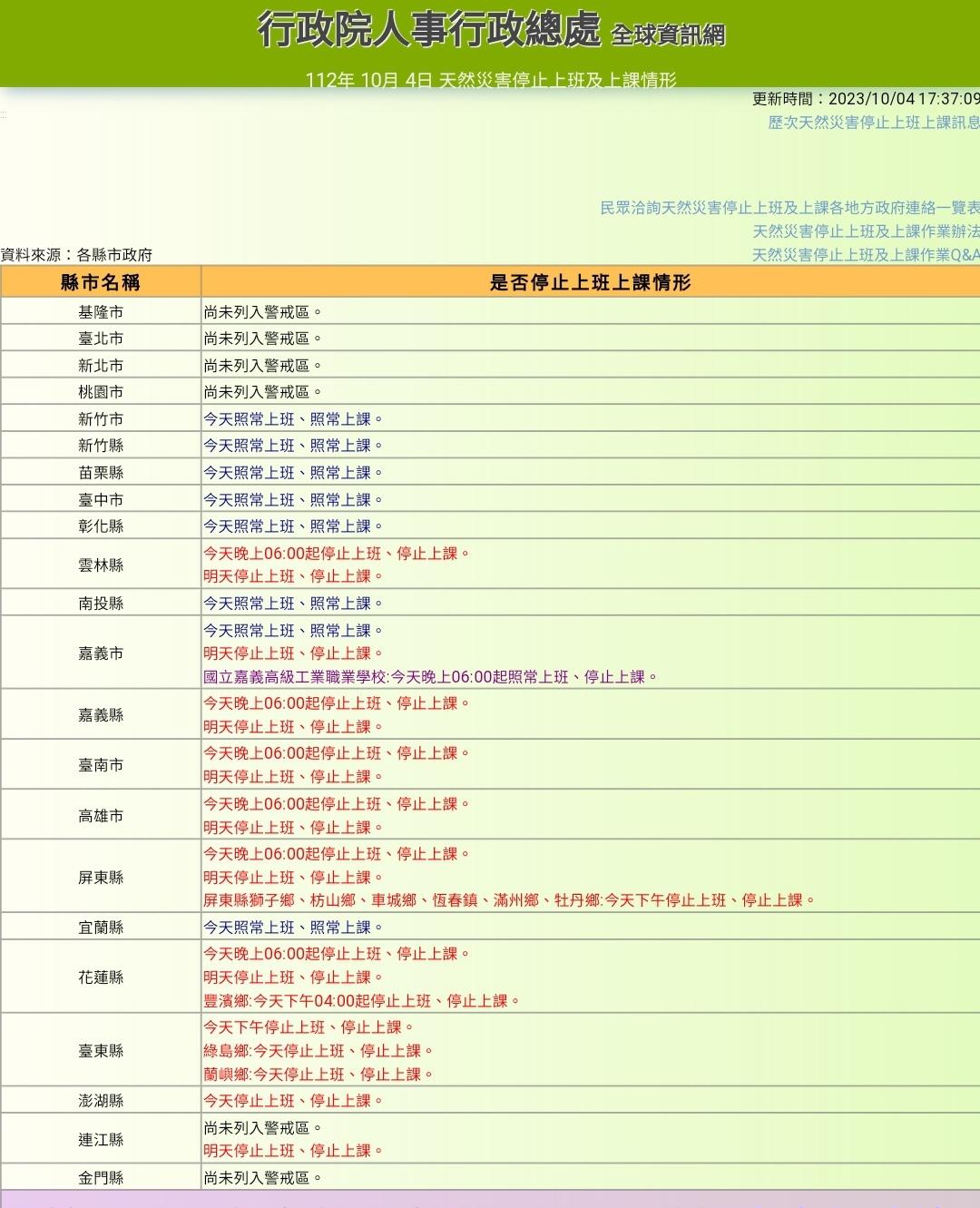 推 fspmlp : 嘉義、屏東宣布明天(5日)停班停課 10/04 17:01