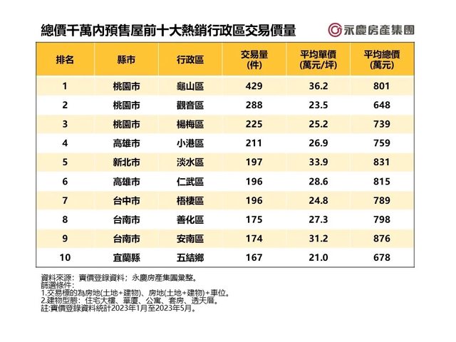 : 實價登錄資料,全台總價1000萬以內的預售屋交易前三名都在桃園市,