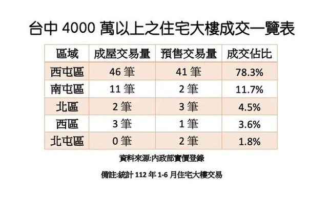 根據內政部資料統計,1~6月台中市總價4000萬以上預售及成屋,受豪宅貸款限制之交易共