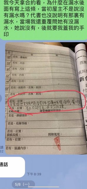 : 後來五月時 她自己發現到合約裡居然藏著一條手寫的 如下面與房仲對話照片