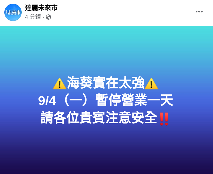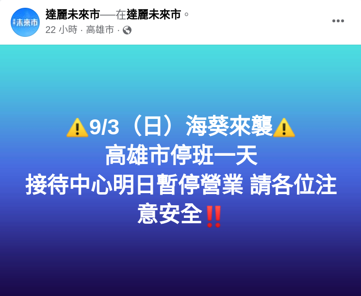 推 empliu: 颱風天達麗未來市放假一天 09/03 19:00