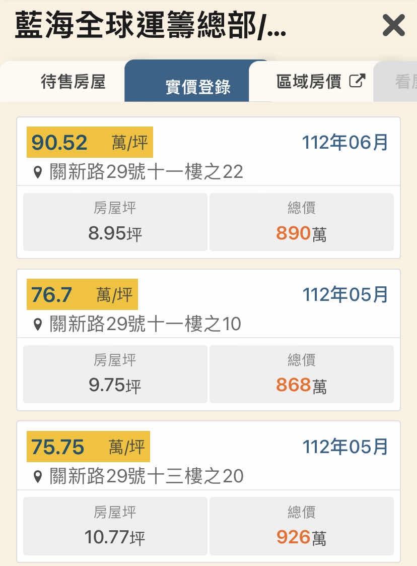 mrporing: 因為他看實登其他戶才22/23,前年該棟有55萬一坪賣出 09/12 09:18