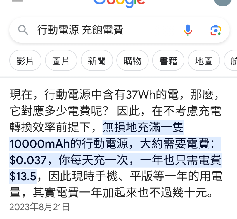 推 sgxm3: 以為佔手機充電不用錢,結果省的錢根本不到行動電源損耗的 09/19 00:03