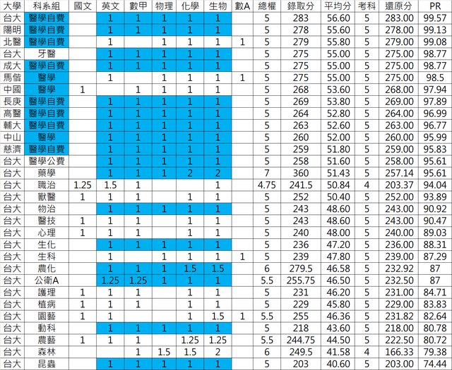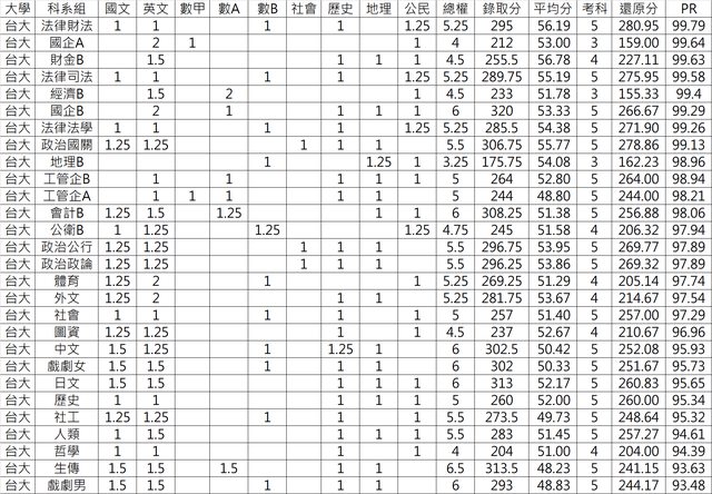 1.台大全部科系
