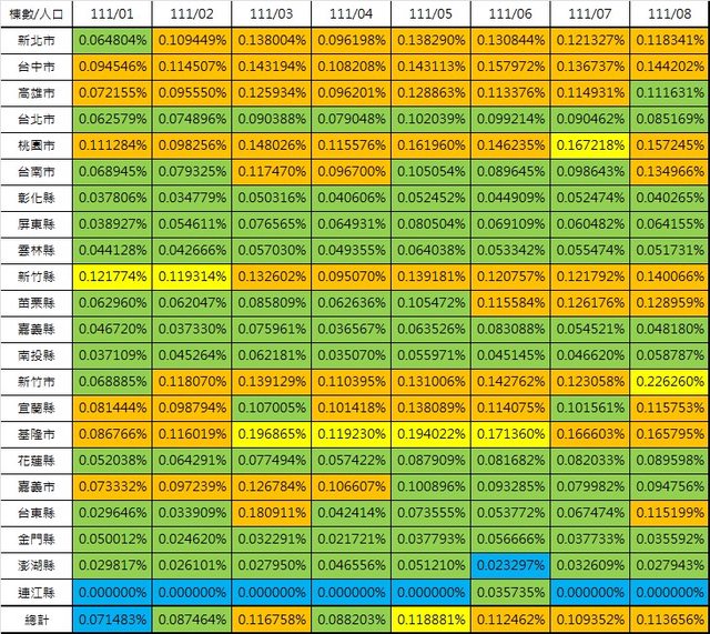 10. 宜蘭縣:+22(+4.409%)