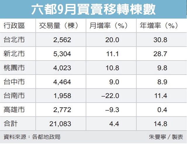六都地政局昨(2)日公布9月買賣移轉棟數,合計21,083棟,月增4.4%、年增14.8%,年增率連三個月收紅,其中,台北、桃園分別寫下近16個月、18個月的新高紀錄。