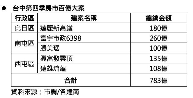 綜觀台中第四季百億大案,集中分佈於烏日、南屯、西屯三區,其中烏日高鐵特區的達麗&