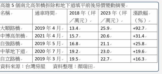 25.9萬元,漲幅高達92.7%,其次為橫跨高雄車站的中博高架橋,距離2021年4月完工通