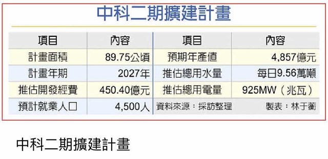 中科二期擴建計畫面積89.75公頃,規劃2027年全區完工,將引進半導體相關產業,預計