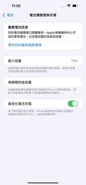 2.電池健康度 78% (保固內可至直營店或官方認證維修處免費更換電池)