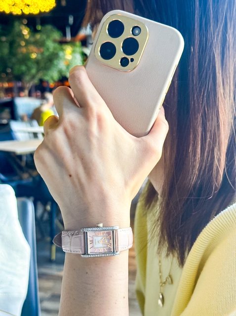 特別是左右兩排的鑲鑽排列,還有粉色底與金色羅馬數字結合的錶面
