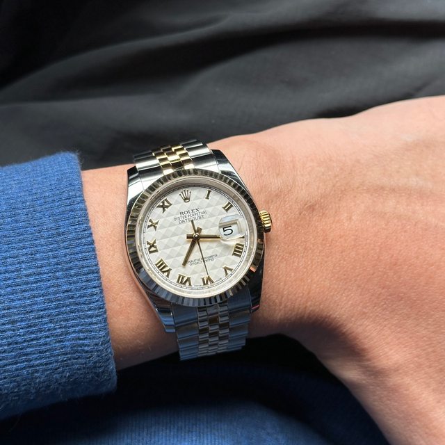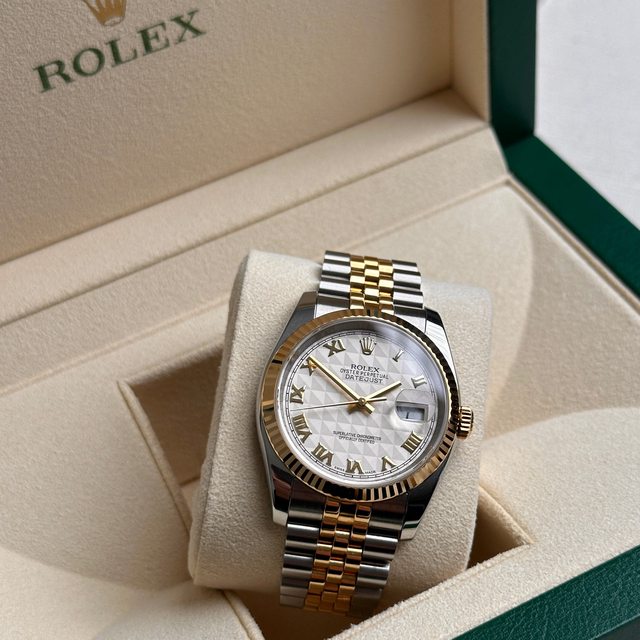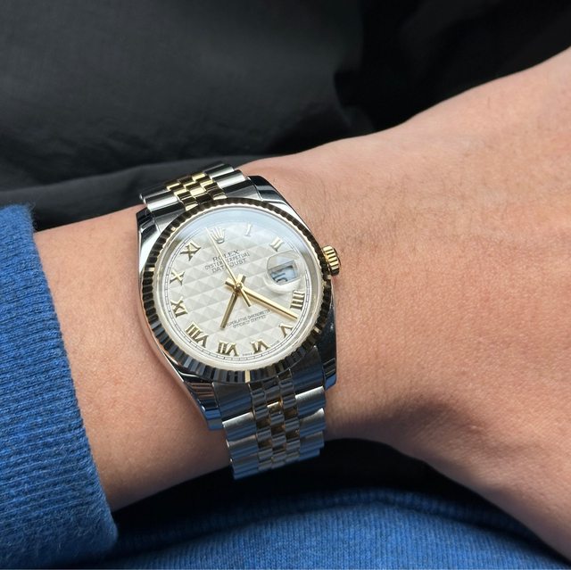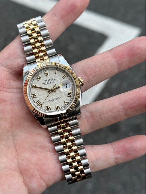物件描述 :95新,正常使用痕跡,36mm半金datejust,金字塔面,錶節數目齊全無缺節